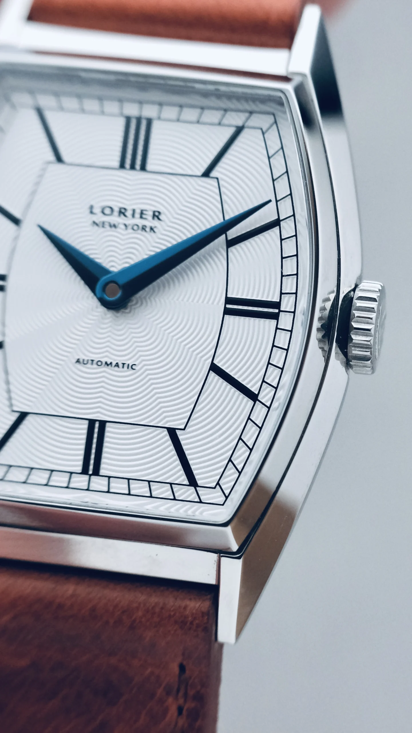 Le cadran a lui aussi beaucoup à offrir. Il est doté d’une finition guillochée très réussie qui se marie parfaitement avec la configuration semi-sectorielle créée par les deux pistes, l’une encapsulant les indices des heures et l’autre des minutes. Lorsque j’ai vu le cadran pour la première fois, ainsi que les aiguilles dauphine bleues, je m’attendais à voir des chiffres romains façon Cartier Tank. Au lieu de cela, Lorier a opté pour des indices bâtons, doublés aux positions 3, 6 et 9 et triplés à la position 12. Cela rend le cadran lisible et fonctionnel, même si la Zephyr reste une montre très élégante. Le chemin de fer des minutes me fait également penser à une Tank, et je suis content que Lorier n’ait pas choisi de se rapprocher trop près de l’iconique modèle français.