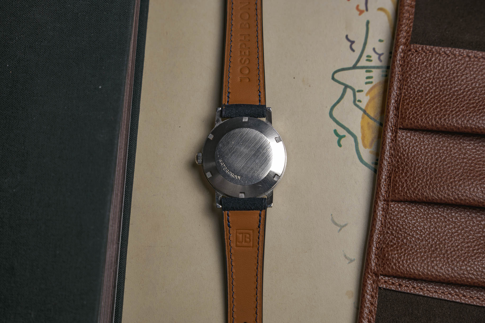 Une montre ronde dévoilant un superbe cadran bleu soleillé où l’on découvre de fins index argentés en applique, une date à trois heures ainsi que les cinq étoiles à six heures, synonymes à l’époque d’une qualité supérieure de calibres.