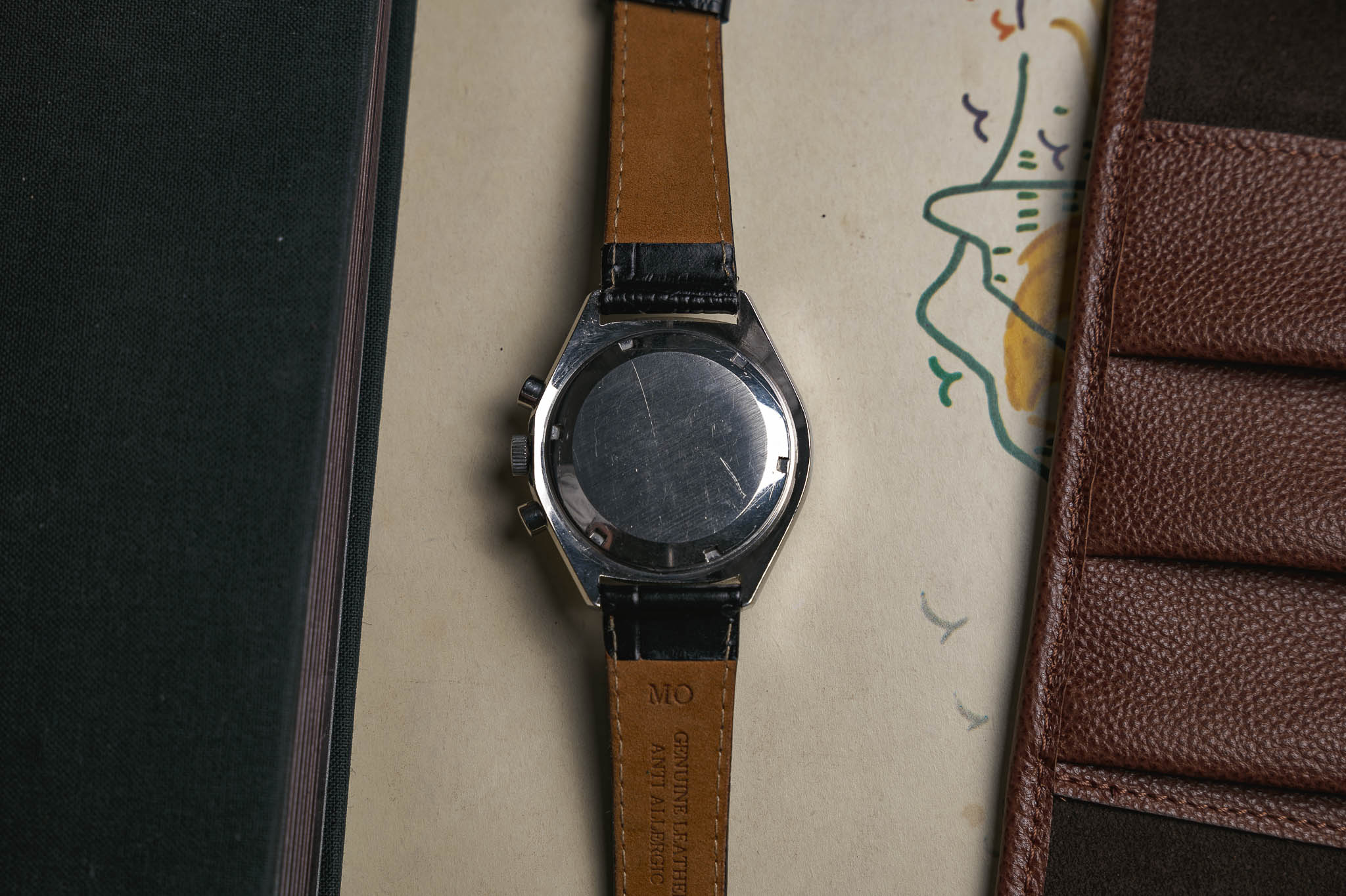 On remarque cette montre Tissot grâce à son très beau et important boitier typique des années 1970, accompagné d’un mouvement de chronographe avec totalisateur des minutes par aiguille centrale à extrémité de flèche, qui n’est autre qu’un calibre Lemania 1343.