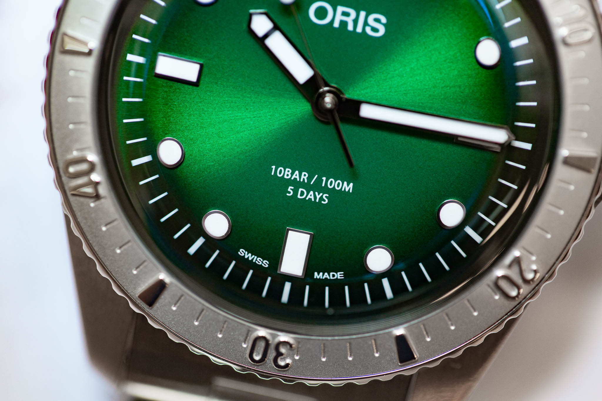 Pour rester dans les tons verts, mais cette fois plus naturels et proches de la forêt automnale, Oris a présenté une nouvelle variation de sa Divers Sixty-Five au boitier de 40 mm, ici avec un superbe cadran vert clair, combiné à un insert vert en aluminium.