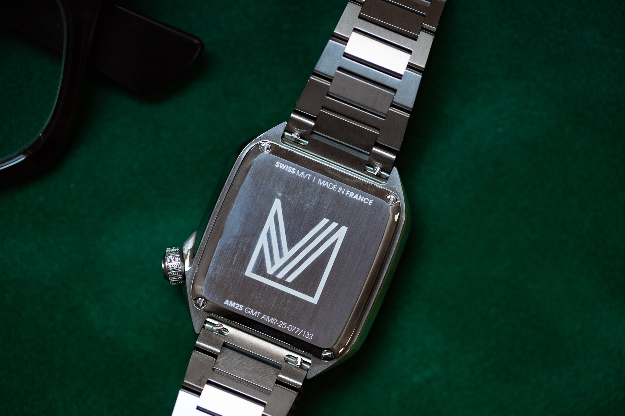 L’apparition d’une fonction GMT sur le boitier anguleux de la AM2 que nous connaissons si bien pour son identité March LA.B, son alternance de polis et brossés, ainsi que ses index très seventies et dont la disposition rend le cadran bien dynamique, nous donnait de belles émotions à la fin 2024. Pour faire ce lancement, March LA.B avait introduit aux côtés de La Joux Perret le calibre mécanique à remontage automatique G110, évolution du G100, en ajoutant la complication de GMT.