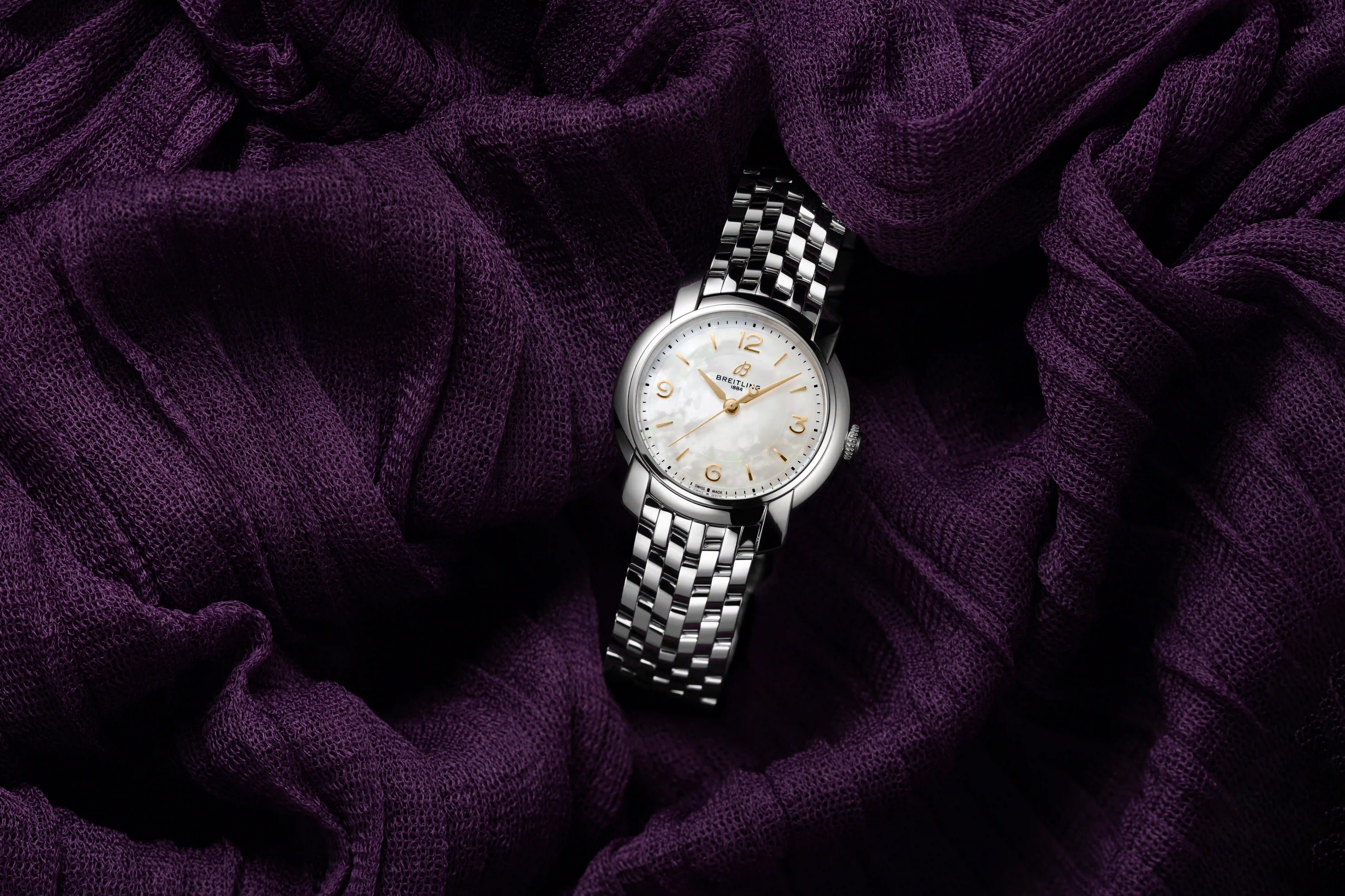 Il est clair que Breitling ne s’est pas contenté de créer une petite montre avec un mouvement banal et des diamants, ce qui correspond à l’image stéréotypée d’une montre pour femme. Comme elle l’avait déjà fait dans les années 1940 et l’a refait cette année, la marque suisse s’est efforcée de créer avant tout des montres de qualité, élégantes et destinées aux femmes. Et même si Breitling avait déjà créé des collections spécifiques pour femmes dans les années 1980 – les Lady-J et Wings Lady, essentiellement des montres de plongée raffinées –, il était temps qu’elle se concentre à nouveau sur la fabrication de montres élégantes pour femmes en effet mais destinées à un usage quotidien. Les prix de la Lady Premier commencent à 4 800€ pour le modèle quartz 32 mm avec cadran en nacre et vont jusqu’à 16 000€ pour le modèle automatique 36 mm en or rose.