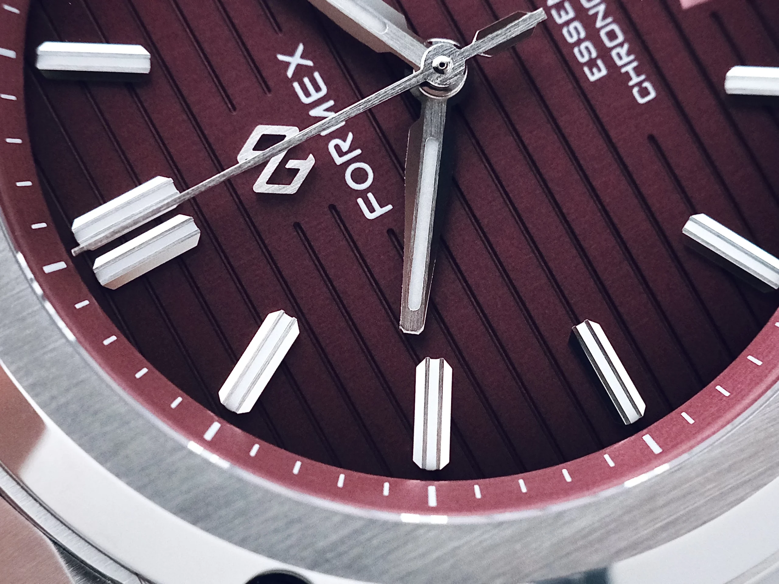 L’aspect légèrement avant-gardiste du boîtier est compensé par un cadran plutôt délicat et élégant, dont la principale caractéristique est le cadran Gamaret rouge foncé, nommé d’après un cépage suisse, complété par des lignes horizontales profondes usinées par CNC et un dégradé appliqué à la main pour imiter les différentes nuances de rouge sous différents angles, comme le vin changerait de couleur en tourbillonnant dans un verre. La cerise sur le gâteau, ce sont les index appliqués à multiples facettes avec des parties supérieures brossées et des chanfreins polis, les aiguilles fines dont le design a été inventé par Formex et qui sont finies de la même manière, ainsi que le guichet de date trapézoïdal biseauté niché à six heures. Sur un rehaut étroit et raide, on trouve une minuterie qui permet de régler l’heure à la minute près. Dans l’ensemble, le cadran et le boîtier présentent donc un design cohérent qui s’harmonise parfaitement.